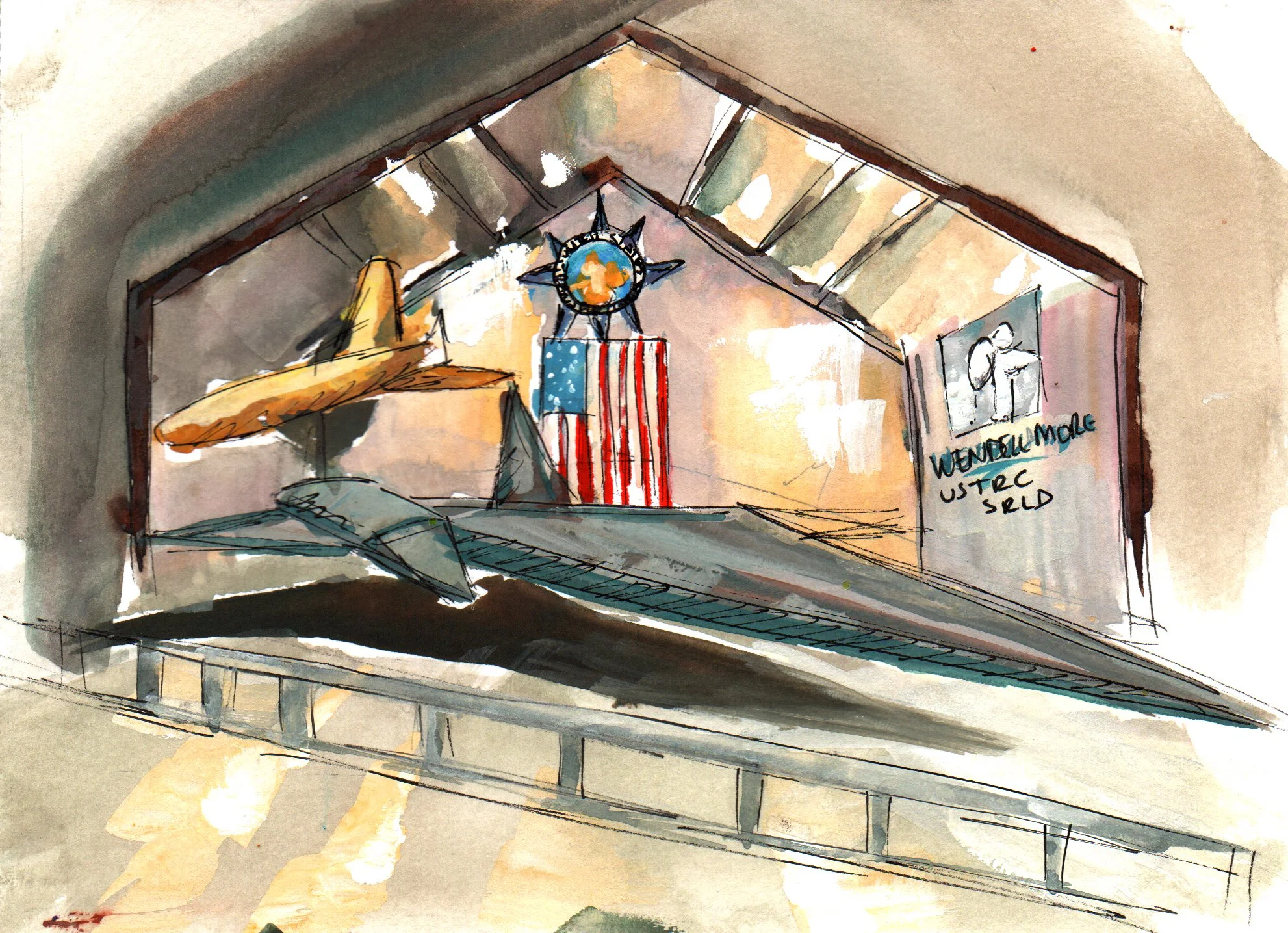 From there, guests enter one of two load bays, each themed as a testing hangar. Four riders at a time are strapped into jetpacks, preparing for liftoff.