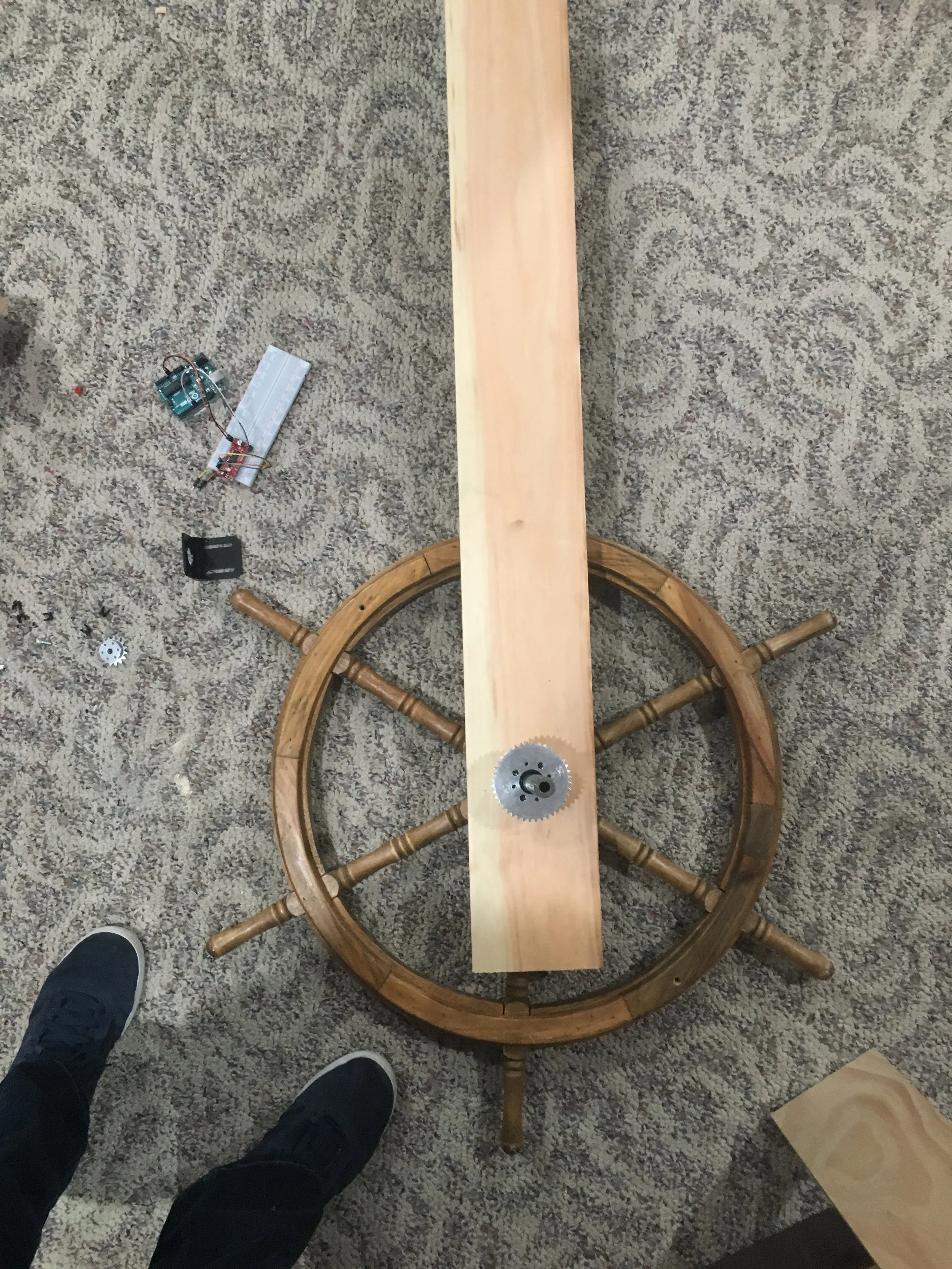 I mounted the wiper motor to the steering column, where it drove an arm connected directly to the wheel. This allowed the wheel to move back and forth in a realistic, repeating motion, simulating the pirate endlessly steering his ship through stormy seas. Designing and refining this mechanism taught me the importance of motor selection, torque requirements, and mechanical linkage design—key lessons that carried into later projects.